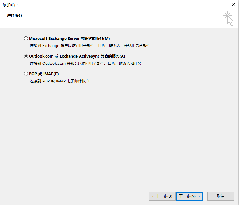 2.選擇服務。選擇outlook.com或Exchange ActiveSync兼容服務(A)
