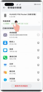 - 云備份數據可在華為帳號?>?云空間?>?管理云存儲空間?>?云備份?>?選擇設備?>?恢復數據查看云備份記錄中的數據,若是需要查看具體數據內容可點擊云備份恢復后在手機本地查看。