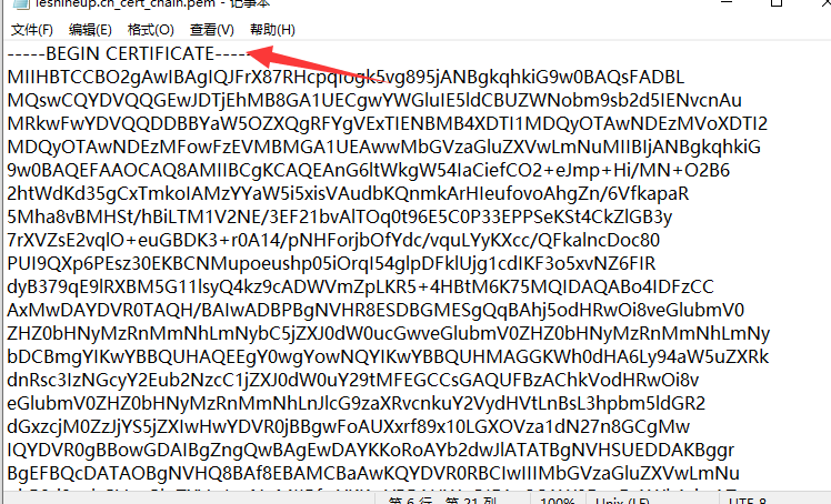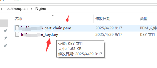 打開文件夾后,您會看到兩個重要的文件,分別是包含 key 私鑰的文件和 pem 格式的證書文件。請分別用記事本打開這兩個文件,以便提取里面的內容進行配置。