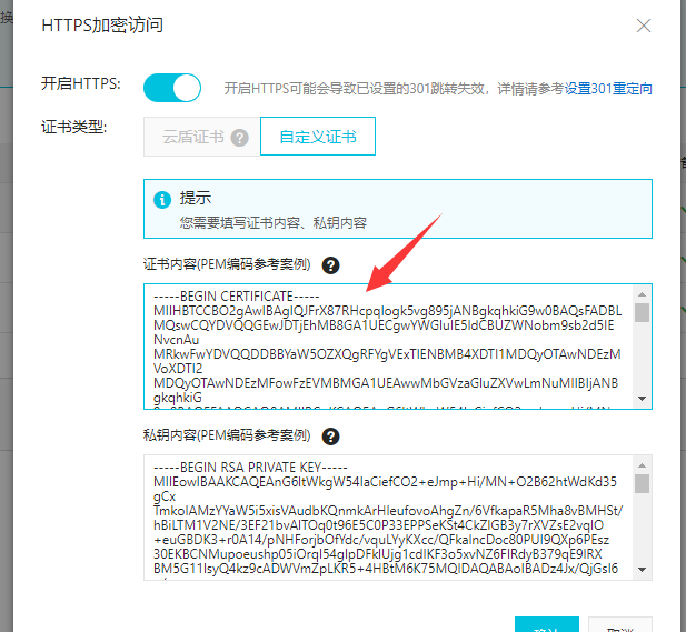 接著,找到【證書內容】的輸入框。同樣地,將 pem 證書文件中的內容復制下來,粘貼到這個輸入框中。請仔細核對粘貼的內容,確保證書信息準確無誤。(配圖:pem 證書文件內容及證書輸入框界面)